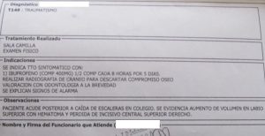 En rigor, el informe del hospital, al que tuvo acceso este medio señala textualmente en el área asignada a las observaciones médicas: “Paciente acude posterior a caída de escaleras en colegio. Se evidencia aumento de volumen en labio superior con hematoma y pérdida de incisivo superior derecho”. El documento (imagen secundaria de esta nota) lo firma la doctora Daniela Isabel Dintinosante.