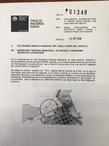 Pero hay más. Un nuevo documento (el 01348) que va dirigido a Eduardo Sboccia Serrano, representante legal de Casino del Lago (Enjoy), ratifica el anterior y señala textual: “Se realiza un análisis respecto al P.R.C. (Plan Regulador Comunal) vigente para la comuna de Pucón, en el cual, la información para esta zona en particular, no es clara ni precisa en el plano (no se identifican claramente las zonas y sus respectivos límites en su área de análisis) y no es reconocida en la Ordenanza, produciéndose así una ambigüedad en su lectura generando un ‘vacío legal’ en su normativa, para la aplicación de estándares mínimos que debe exigir un Plan Regulador Intercomunal”.