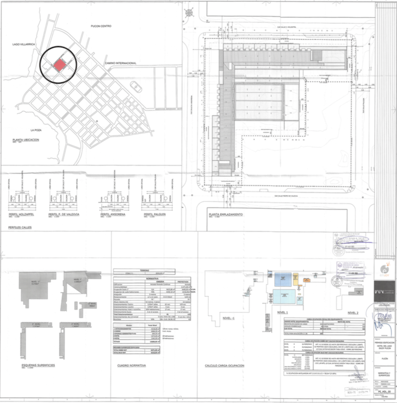 Pero para entender el proyecto, posterior al cambio de la ubicación original (a un costado del Gran Hotel Pucón), hay que remitirse al informe de la SCJ y al acta del consejo resolutivo que posibilitó el mover el edificio a la manzana comprendida por las calles Holzapfel, Palguín, Pedro de Valdivia y Ansorena. En el informe de diciembre de 2019, la SCJ informa al consejo resolutivo que los planes de la empresa son cambiar de ubicación el proyecto y se comprometían con algunas propuestas que, a juicio de la compañía, le darían mayor realce a la edificación. Una de ellas era un estacionamiento subterráneo con capacidad para 120 vehículos. Esto, junto a otros ítems, fue marcado como “obras complementarias” comprometidas por la empresa.