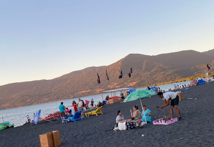 20:30 hrs. Comienza a caer la noche, y de igual forma el termómetro en la playa. Con la caída del sol se observa como un gran porcentaje del público playero comienza a retirarse del lugar, y cientos de automovilistas forman una gran congestión vehicular por las arterias céntricas de Pucón. Al mismo tiempo, los locatarios del lugar comienzan a cerrar sus puestos, y a retirar sus embarcaciones acuáticas del borde del lago. El “sunset” (puesta de sol) parece dar por finalizada una nueva jornada de playa y arena. Sin embargo, aún resta lo que algunos locatarios identificaron como el “carrete masivo”.