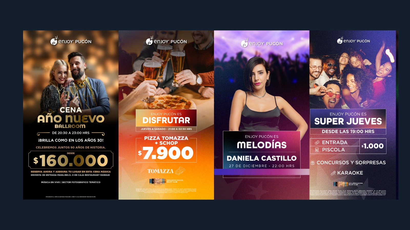 ¡Ven y vive la magia de diciembre con nosotros en Enjoy Pucón! Recuerda que todas las promociones son exclusivas para socios Enjoy Club y están sujetas a cambios sin previo aviso. Para más detalles, visita nuestras bases y condiciones en www.enjoy.cl.