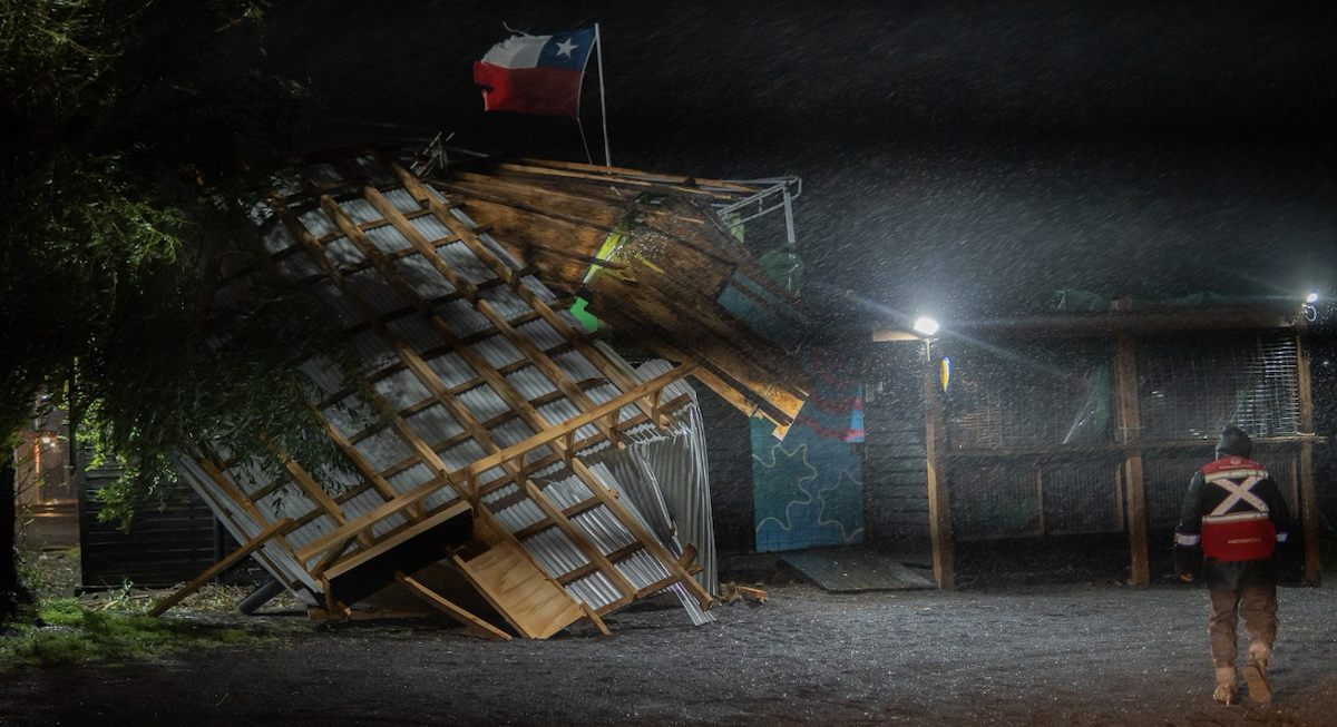 Se esperaba y tal como se anunciaba ocurrió. La noche de temporal en Pucón estuvo intensa y fue marcada, además de la lluvia, por fuertes ráfagas de viento que en algunos sectores sobrepasaron los 100 kms./hrs. (se registraron hasta 112 kms./hrs.). Y lo anterior, obviamente, tuvo efectos. Entre los más importantes fue la voladura de techo de un local comercial en la Playa Grande en las primeras horas de la noche del jueves (foto principal). Hasta allí llegó el personal de emergencias para mantener un perímetro de seguridad y evitar mayores riesgos.