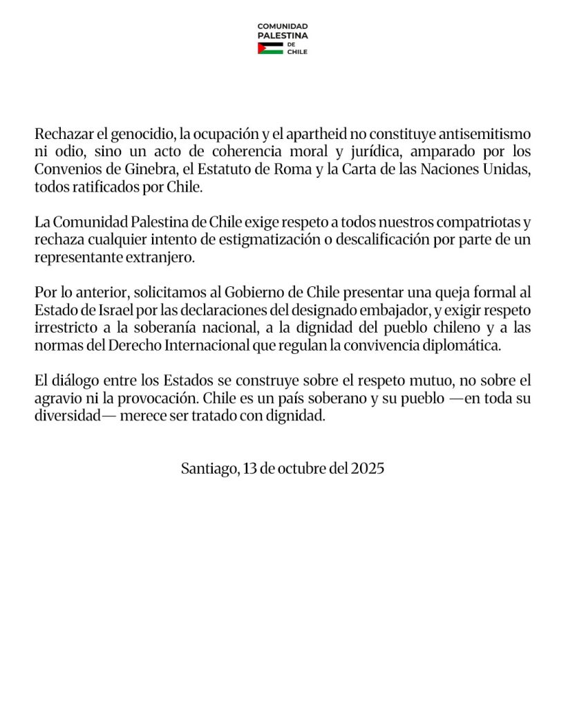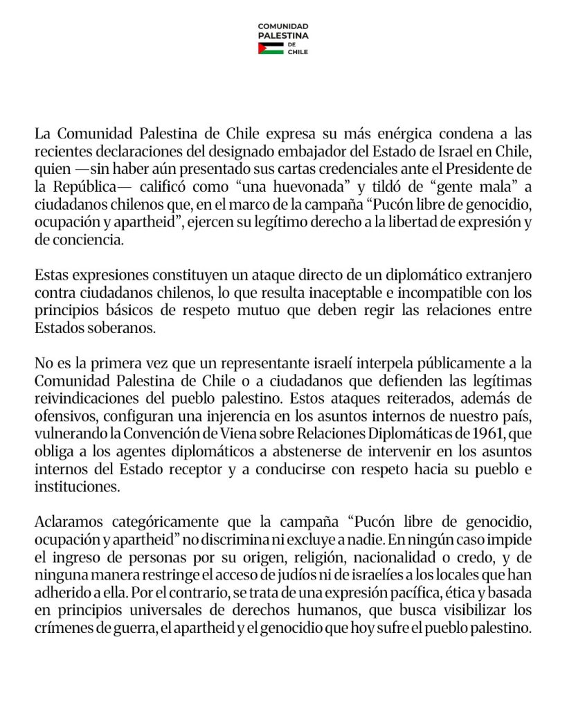 Ahora fue el turno de la Comunidad Palestina en Chile, quienes emitieron un comunicado condenando los dichos de Lewi. “La Comunidad Palestina en Chile expresa su más enérgica condena a las recientes declaraciones del designado embajador del Estado de Israel en Chile, quien —sin haber aún presentado sus cartas credenciales ante el Presidente de la República— calificó como ‘una huevonada’ y tildó de ‘gente mala’ a ciudadanos chilenos que, en el marco de la campaña ‘Pucón libre de genocidio, ocupación y aparttheid’, ejercen su legítimo derecho a la libertad de expresión y de conciencia”, se lee en el texto, en el que se agrega: “Estas expresiones constituyen un ataque directo de un diplomático extranjero contra ciudadanos chilenos, lo que resulta inaceptable con los principios básicos de respeto mutuo que deben regir las relaciones entre Estados soberanos”.
