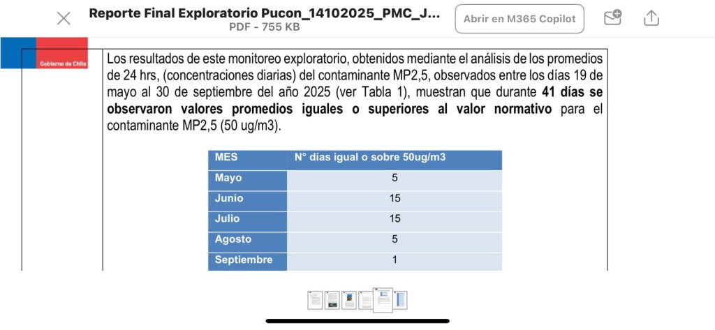 La verdad es que era algo que se preveía. Pero el monitoreo exploratorio realizado por la seremi de Medioambiente en conjunto con la municipalidad reveló datos y agregó un problema más a la comunidad local: los altos índices de contaminación que se vive en invierno, principalmente, por el uso de la leña. En rigor, los resultados de la central de monitoreo instalada en el Estadio Fiscal Osvaldo Muñoz Carrillo en otoño mostraron que en 41 días entre el 19 de mayo y el 30 de septiembre se sobrepasó la norma de material particulado (MP) 2,5 suspendida en el aire.