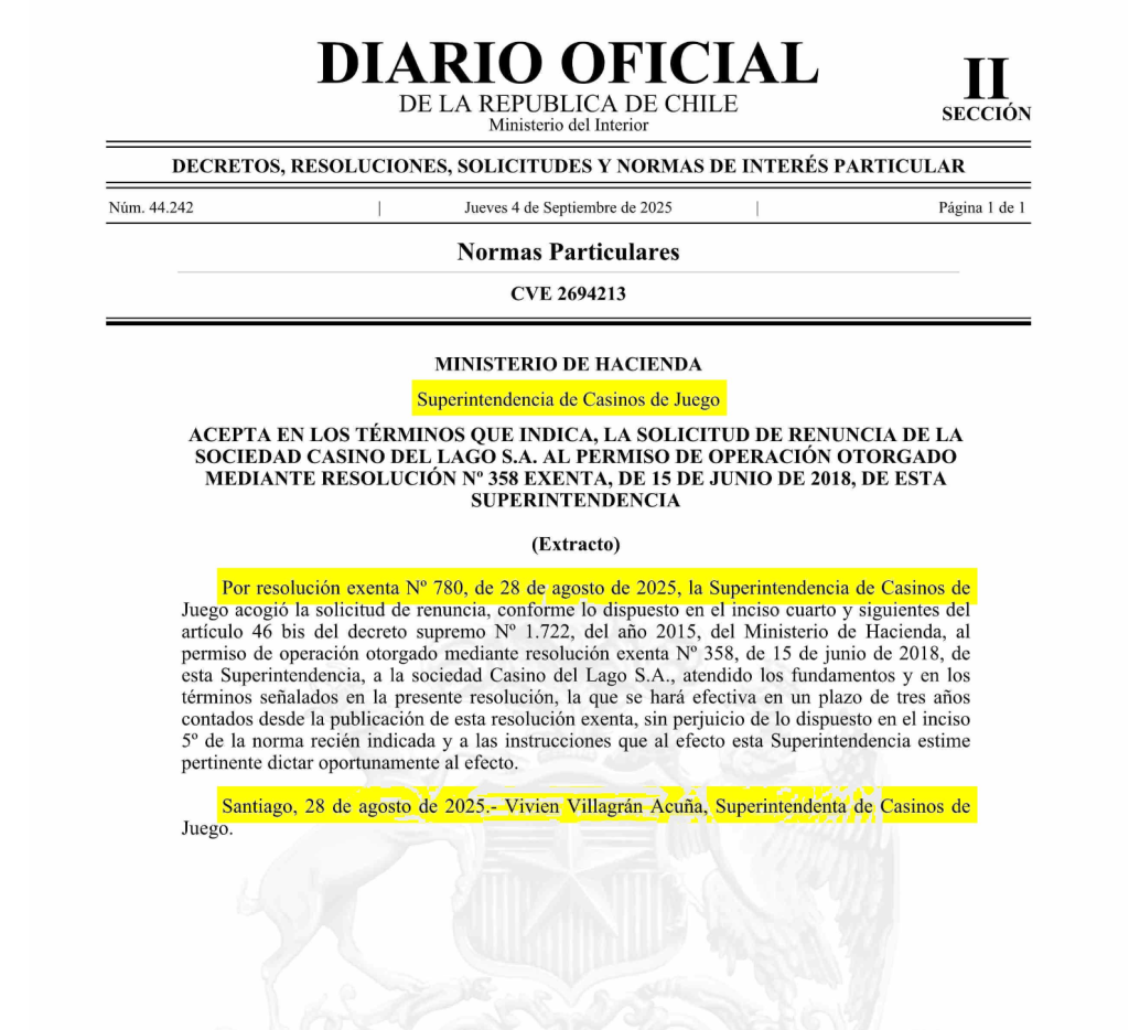 Solo faltaba un trámite y se cumplió. Se trara de la publicación en el Diario Oficial del ministerio de Hacienda que hace oficial la salida de la Sociedad Casino del Lago S.A, dependiente de Casinos Chile S/A, empresa que se genera a partir de la reorganización judicial de la matriz Enjoy; al principal centro de juegos de azar Pucón. La publicación se hizo efectiva el pasado cuatro de septiembre y desde ahí comienza a correr el plazo autoimpuesto por la superintendencia de Casinos y Juegos (SCJ) de 120 días hábiles para llamar a un nuevo proceso licitatorio.