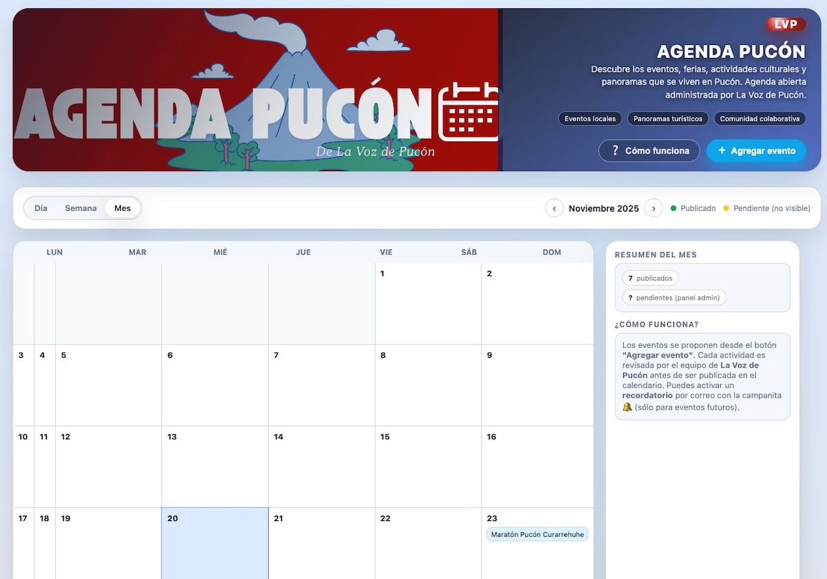 Pucón vive un calendario dinámico, diverso y en constante movimiento. Sin embargo, muchas actividades pasan desapercibidas simplemente porque no existe un espacio único donde encontrarlas. Para enfrentar ese desafío, hoy se lanza oficialmente Agenda Pucón (www.agendapucon.cl), una plataforma abierta, colaborativa y gratuita diseñada por La Voz de Pucón para reunir en un solo lugar todos los eventos locales.