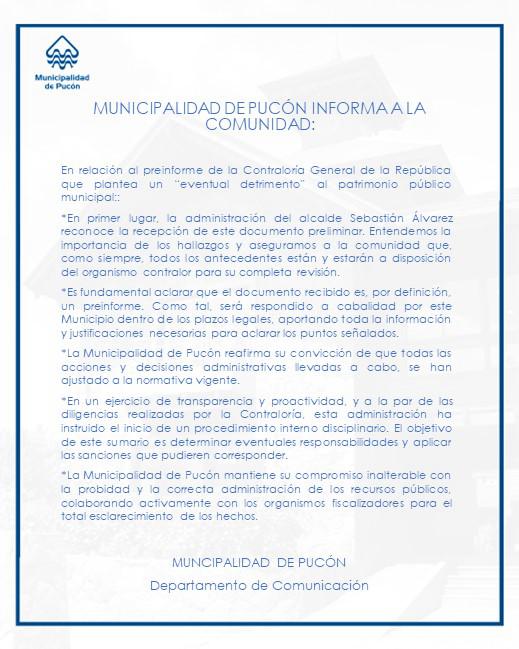 Agregan, eso sí, que están convencidos que han actuado apegado a la Ley: “La municipalidad de Pucón reafirma su convicción de que todas las acciones y decisiones administrativas llevadas a cabo se han ajustado a la normativa vigente”. También reconocen, eso sí, la apertura de un “procedimiento interno disciplinario”. “El objetivo de este sumario es determinar eventuales responsabilidades y aplicar las sanciones que pudieren corresponder”.