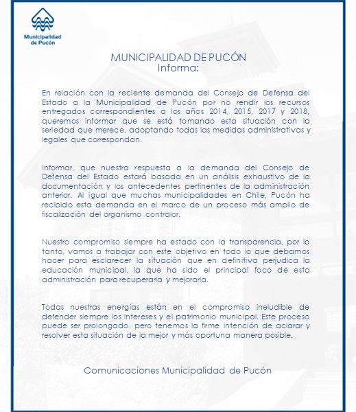 Quienes también salieron al paso de la publicación fue la municipalidad. Desde el departamento de Comunicaciones hicieron llegar un comunicado en el que reconocían la notificación de la demanda; y que responderían a ella con los antecedentes que manejaban. “Nuestra respuesta a la demanda del Consejo de Defensa del Estado estará basada en un análisis exhaustivo de la documentación y los antecedentes pertinentes de la administración anterior. Al igual que muchas municipalidades de Chile, Pucón ha recibido esta demanda en el marco de un proceso más amplio de fiscalización del organismo contralor”, sostuvieron en el documento.