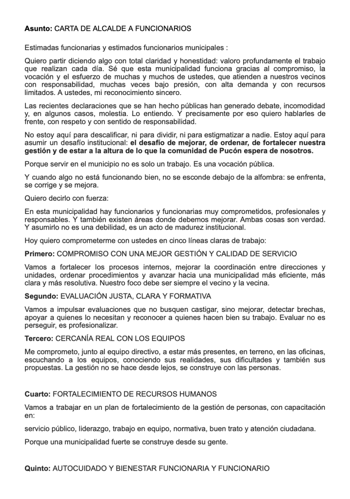 ”Quiero ser muy claro en algo: Esto no es contra ustedes, es con ustedes. No se trata de dividir, se trata de mejorar juntos. No se trata de señalar, se trata de corregir y fortalecer. No se trata de criticar, se trata de construir una mejor municipalidad. La comunidad nos observa. Nos evalúa. Nos necesita”, escribe Álvarez, quien al final pide compromiso: “Les pido que asumamos este proceso con madurez, con compromiso y con vocación de servicio. Cada funcionario y funcionaria importa. Cada trámite bien hecho, cada orientación clara, cada buen trato, construye la confianza en esta institución. Sigamos trabajando con orgullo por Pucón, por su gente y por el servicio público. Porque servir bien no es solo un deber: es un acto de dignidad”.