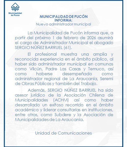 Casi dos meses pasaron para que la municipalidad de Pucón tuviera un nuevo Administrador. Todo esto luego de la salida del controvertido Francisco Torres, quien fue removido en medio del denominado “Caso Sobresueldos”. Si bien el nombre era manejado en los círculos del poder local desde hace al menos una semana, fue hasta el mediodía de este martes que desde el departamento de Comunicaciones de la municipalidad se confirmó que el elegido es el abogado de la Universidad de Valparaíso Sergio Núñez Barruel.