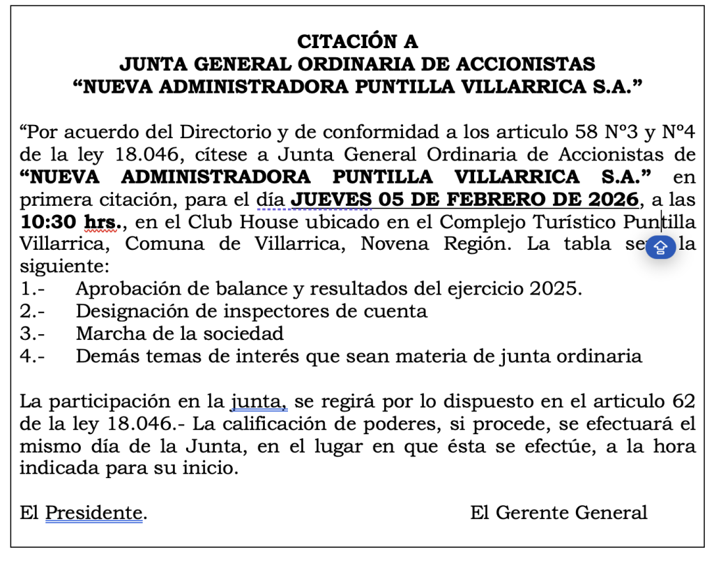 Legales CITACIÓN A JUNTA GENERAL ORDINARIA DE ACCIONISTAS “NUEVA ADMINISTRADORA PUNTILLA VILLARRICA S.A” Publicado 1 semana atrás en Enero 23, 2026 Por Director Share this:FacebookX Related Topics: Tambien CITACIÓN A JUNTA GENERAL ORDINARIA DE ACCIONISTAS “NUEVA ADMINISTRADORA PUNTILLA VILLARRICA S.A” No te pierdas AVISO LEGAL CAUSA V-34-2025 Continue Reading Esto podría gustarte
