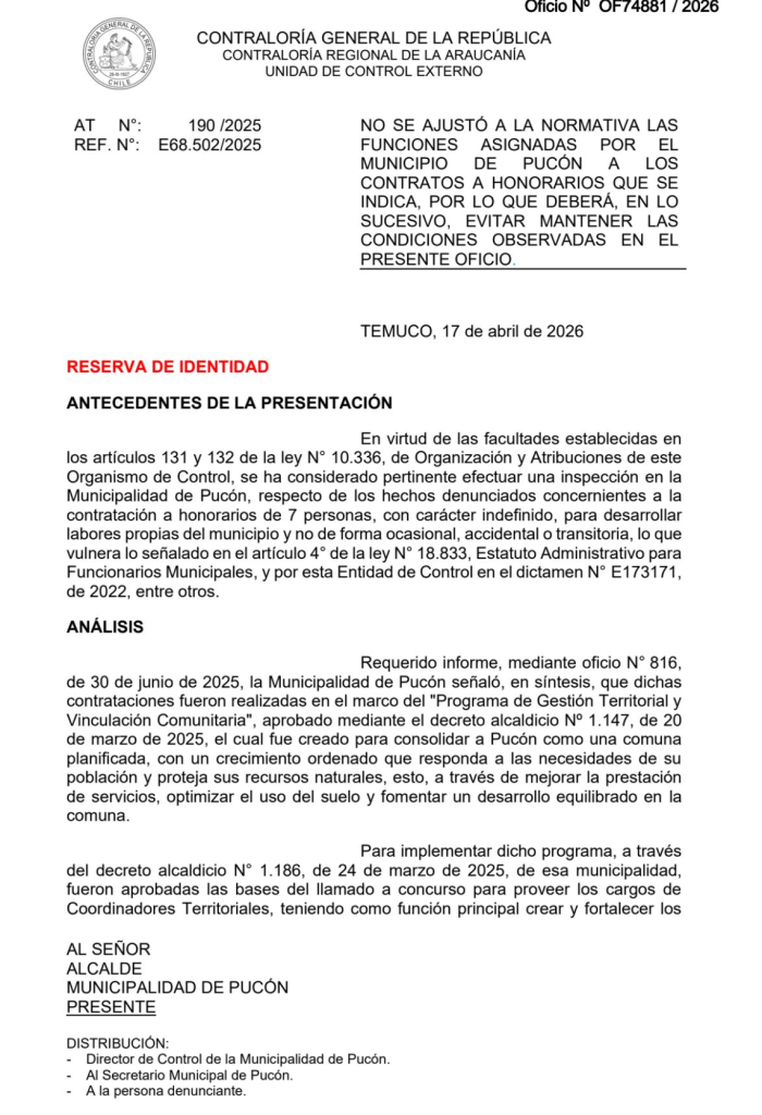 “En mérito de lo expuesto, se advierte que las funciones desempeñadas por los mencionados trabajadores no revisten el carácter de accidentales ni específicas, puesto que estas corresponden a labores permanentes y habituales que son propias de la gestión municipal, lo que contraviene lo dispuesto en el artículo 4° de la ley N°18.883, Estatuto Administrativo para Funcionarios Municipales, que permite la contratación a honorarios únicamente para cometidos específicos y accidentales, sin generar vínculo de subordinación ni dependencia”, se lee en el documento.