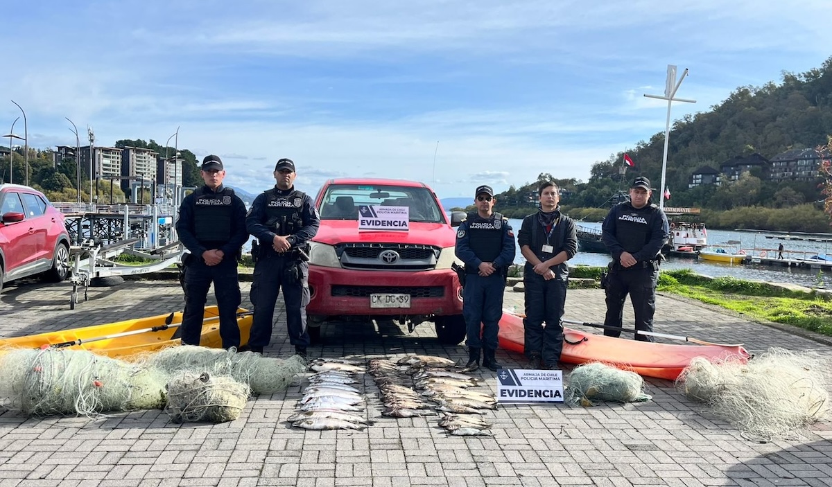 Un golpe fuerte a la pesca furtiva. Eso fue lo que sucedió el pasado fin de semana cuando personal de La Armada y del Servicio Nacional de Pesca (Sernapesca) lograron la detención de cinco pescadores furtivos en la desembocadura del río Blanco en la ribera norte del lago Caburgua.
