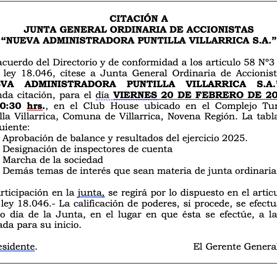 CITACIÓN A JUNTA GENERAL ORDINARIA DE ACCIONISTAS “NUEVA ADMINISTRADORA PUNTILLA VILLARRICA S.A”