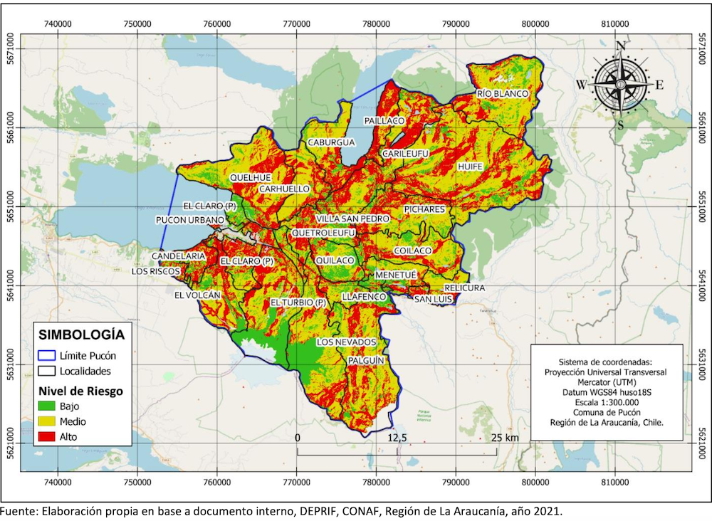 (Imagen principal, mapa de riesgo de incendios forestales de Pucón actualizado a 2021)
