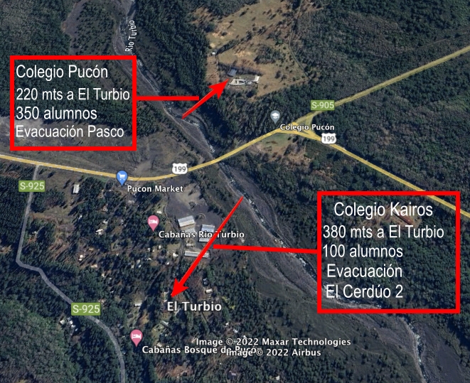 Kairos y Pucón se encuentran a pocos metros del lecho del Río El Turbio, uno de los principales cauces de lahares o corridas volcánicas en caso...